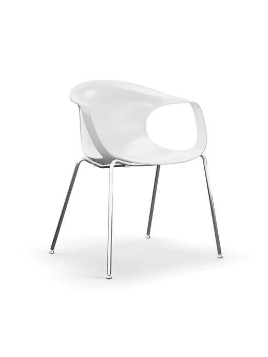 Flick gibt es in zwei Varianten. Beide haben die weiße organisch geformte Sitzschale mit den markanten seitlichen Öffnungen und den raffiniert geschwungenen Armlehnen gemeinsam. In dezenter Zurückhaltung steht Flick auf vier verchromten Beinen; besonders flexibel und leichtfüßig ist der Stuhl mir vier gummierten Universalrollen am verchromten Gestell.